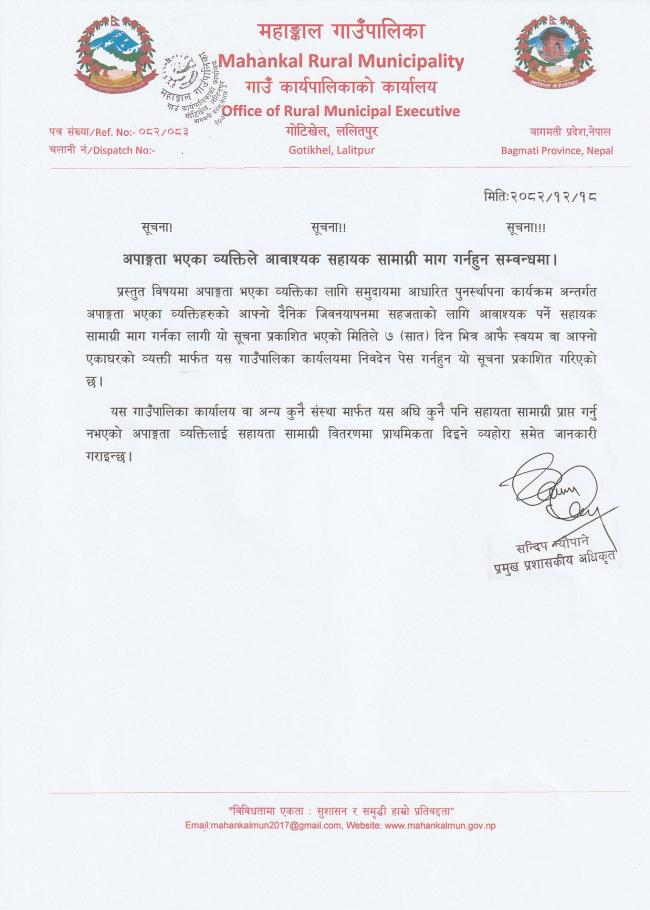अपाङ्गता भएका व्यक्तिले आवश्यक सहायक सामग्री माग गर्नुहुन सम्बन्धमा।