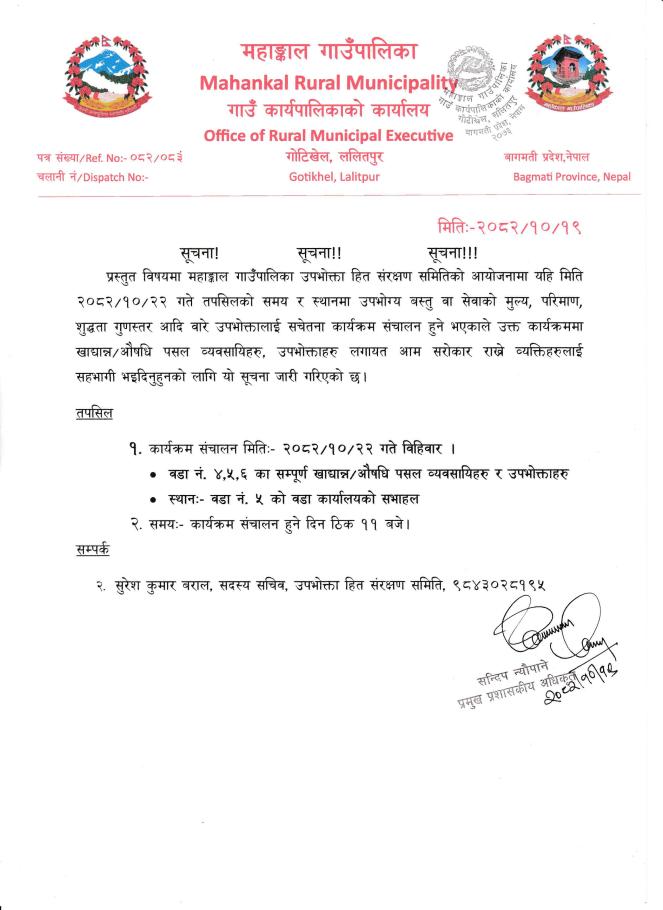 उपभोग्य बस्तु वा सेवाको मूल्य, परिमाण, शुद्धता तथा गुणस्तर बारे उपभोक्ता सचेतना कार्यक्रम सञ्‍चालन सम्बन्धी सूचना।