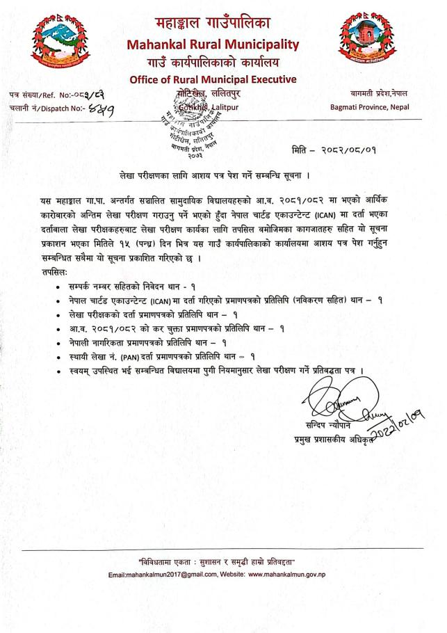 लेखा परीक्षणका लागि आशय पत्र पेश गर्ने सम्बन्धि सूचना।