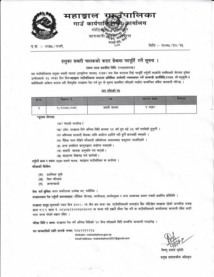 हलुका सवारी चालकको करार सेवामा पदपूर्ति गर्ने सूचना