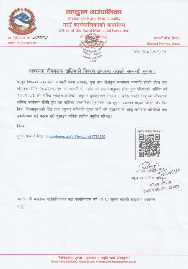 आवश्यक सीपमूलक तालिमको विवरण उपलब्ध गराउने सम्बन्धी सूचना।