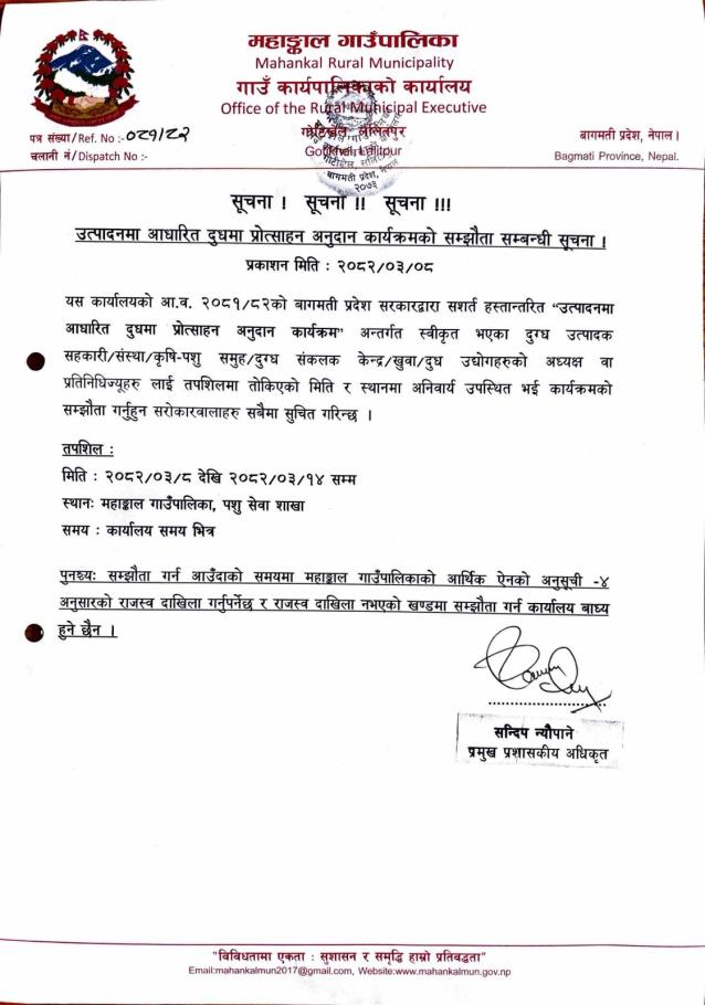 उत्पादनमा आधारित दुधमा अनुदान कार्यक्रमको सम्झौता सम्बन्धी सूचना।