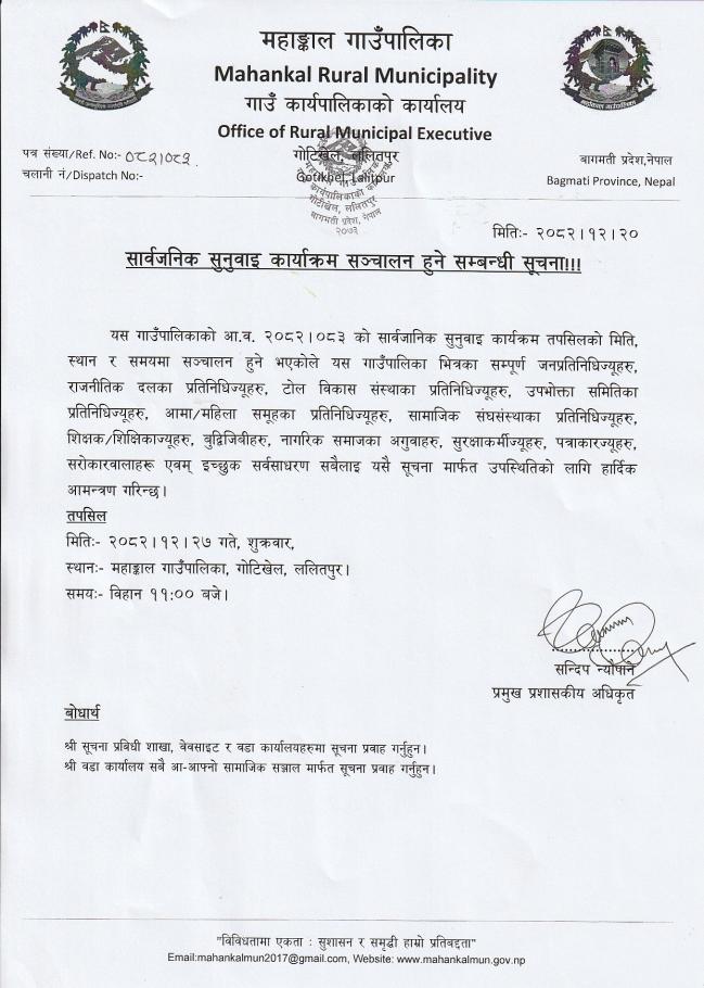 सार्वजनिक सुनुवाइ कार्यक्रम सञ्‍चालन हुने सम्बन्धी सूचना।